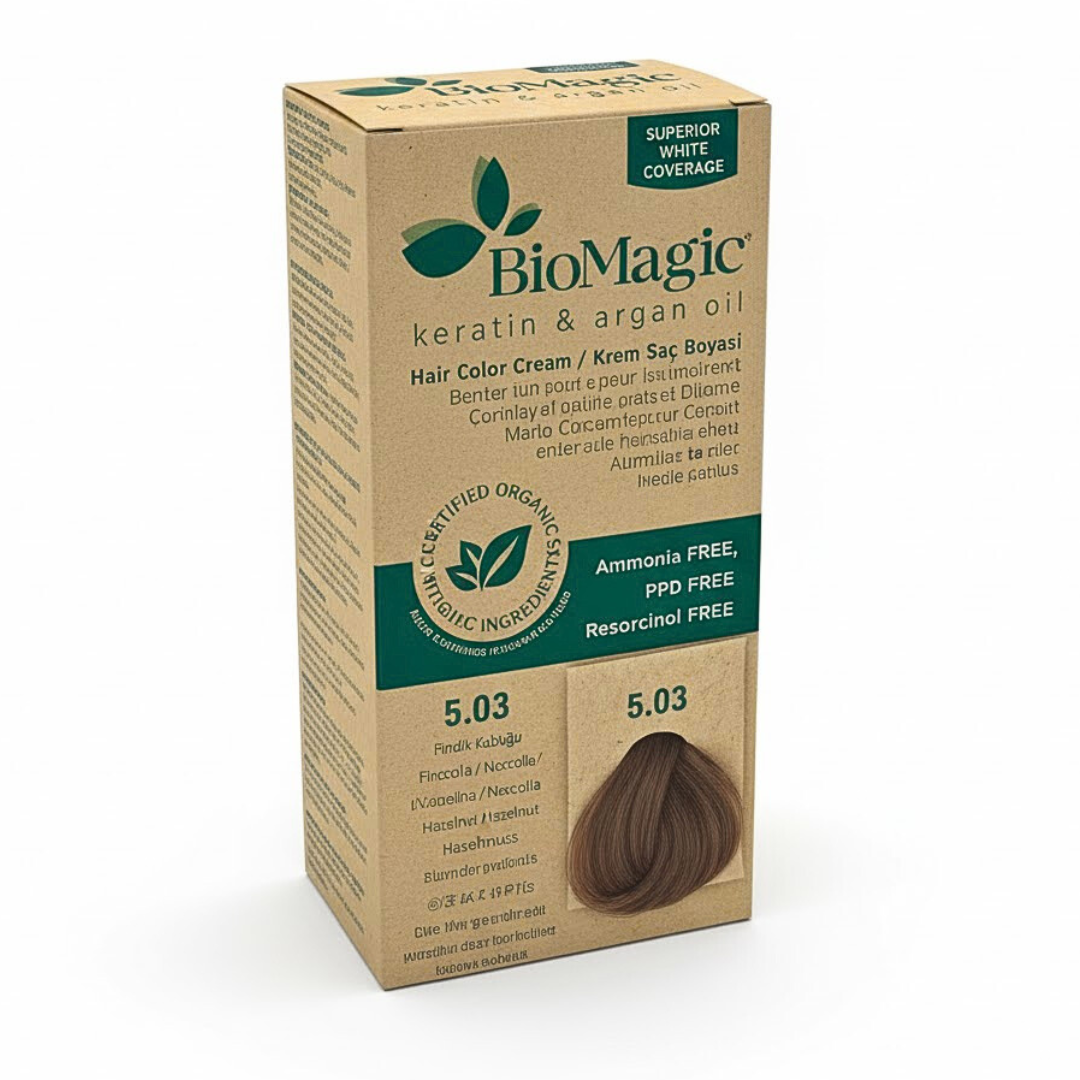 Biomagic Color Cream 5/03 Chatain Clair Natr Dore. Obtenir une coloration châtain clair aux reflets dorés, sans ammoniac et avec une bonne couverture des cheveux blancs, c’est ce que propose le Biomagic Color Cream 5/03. Cette crème colorante s’adresse aux personnes souhaitant masquer leurs cheveux blancs avec une teinte naturelle et lumineuse, particulièrement adaptée aux cuirs chevelus sensibles ou aux cheveux secs, fréquents sous le climat sec marocain. Le tube contient 50ml de produit.