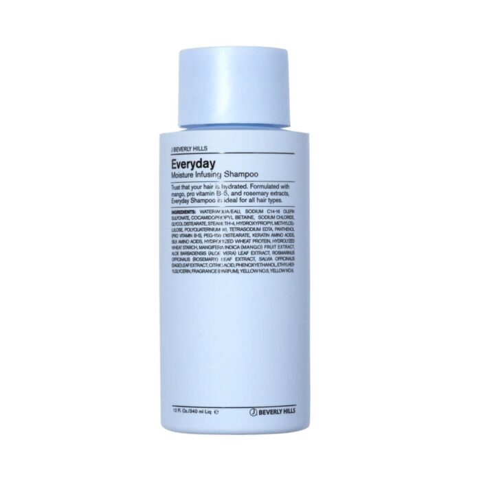 J Beverly Hills Everyday Moisture Shampo 340ml. Hydrater ses cheveux quotidiennement face au climat marocain exige un shampoing qui nettoie sans agresser. Le J Shampoing Beverly Hills Everyday Moisture répond à ce besoin: nettoyage doux et hydratation intense pour tous les types de cheveux, du normal au sec. Ce flacon de 340ml associe des agents nettoyants doux, de la pro-vitamine B-5 et des extraits de romarin pour des cheveux plus forts et brillants dès les premières utilisations.