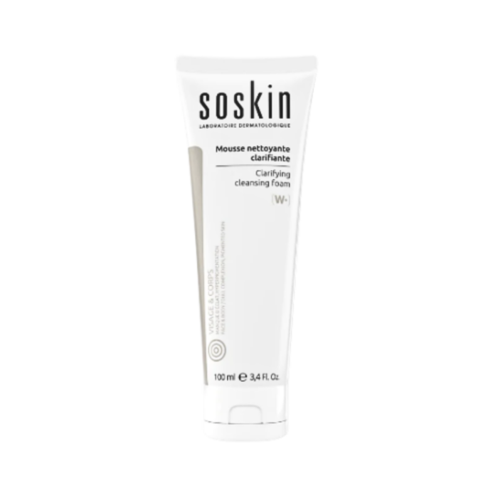 Soskin Mousse Nettoyante Clarifiante 100ml purifie en profondeur et régule le sébum des peaux mixtes à grasses avec une texture légère et mousseuse.