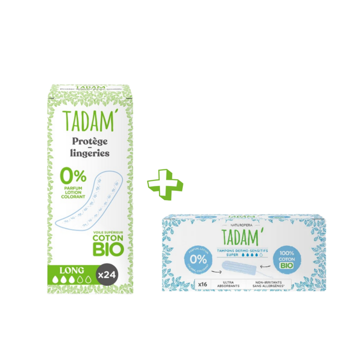 Tadam Duo Pack “2 Tampons Super 16pcs+Protege Long 24pcs”. Gérer ses règles au quotidien demande une protection adaptée à chaque moment de la journée. Le Tadam pack tampons combine deux formats complémentaires: les tampons Super pour une absorption interne efficace, et les protège-lingeries Long pour une protection externe discrète. Ensemble, ils offrent la flexibilité nécessaire face aux variations de flux. Contenance: 16 tampons Super + 24 protège-lingeries Long.