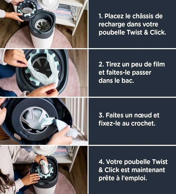 - Insérez le nouvel axe de la recharge Tommee Tippee dans le logement prévu à l’intérieur de la poubelle.